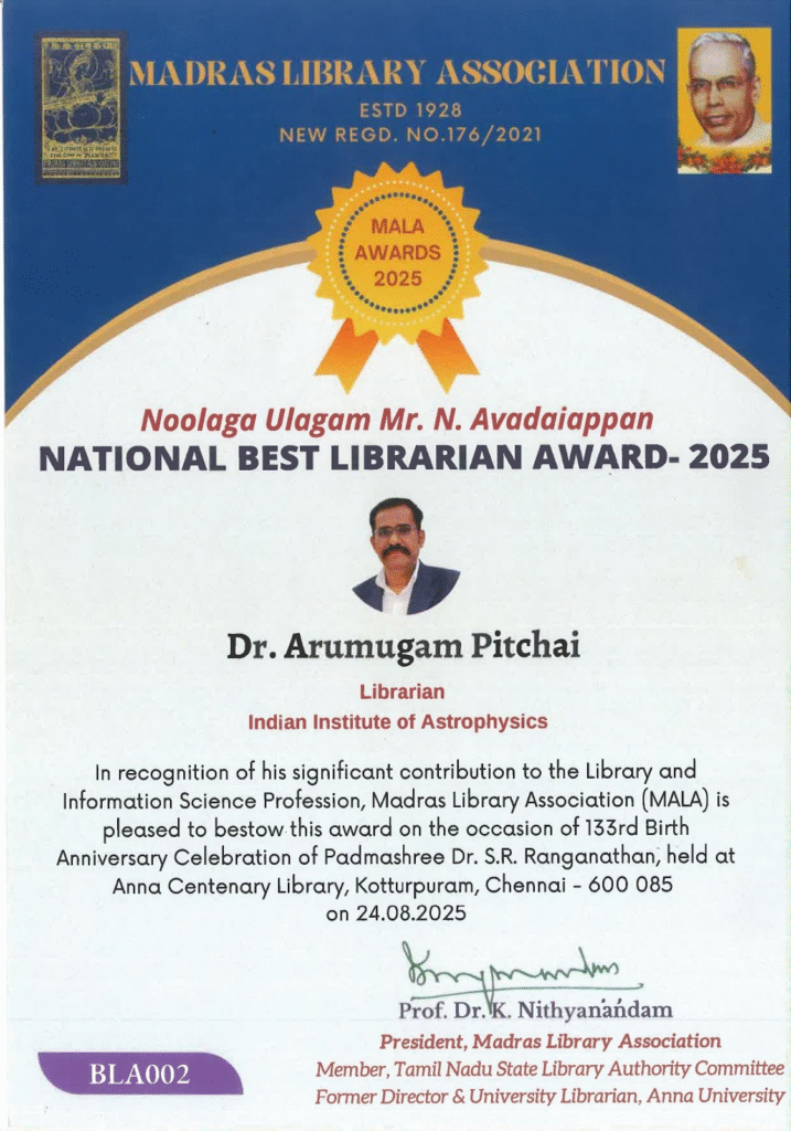 I am profoundly privileged to have been conferred the “National Best Librarian Award 2025” by the Madras Library Association (MALA) — a distinguished professional body with a long and illustrious history of advancing the field of Library and Information Science in India. This recognition was bestowed upon me during the 133rd Birth Anniversary Commemoration of Padmashree Dr. S. R. Ranganathan, held at the Anna Centenary Library, Chennai, in the presence of eminent academicians, library professionals, and scholars from across the nation. Receiving this honour from MALA, one of the oldest and most respected library associations in the country, stands as a significant milestone in my professional journey and a moment of profound gratitude and reflection.
